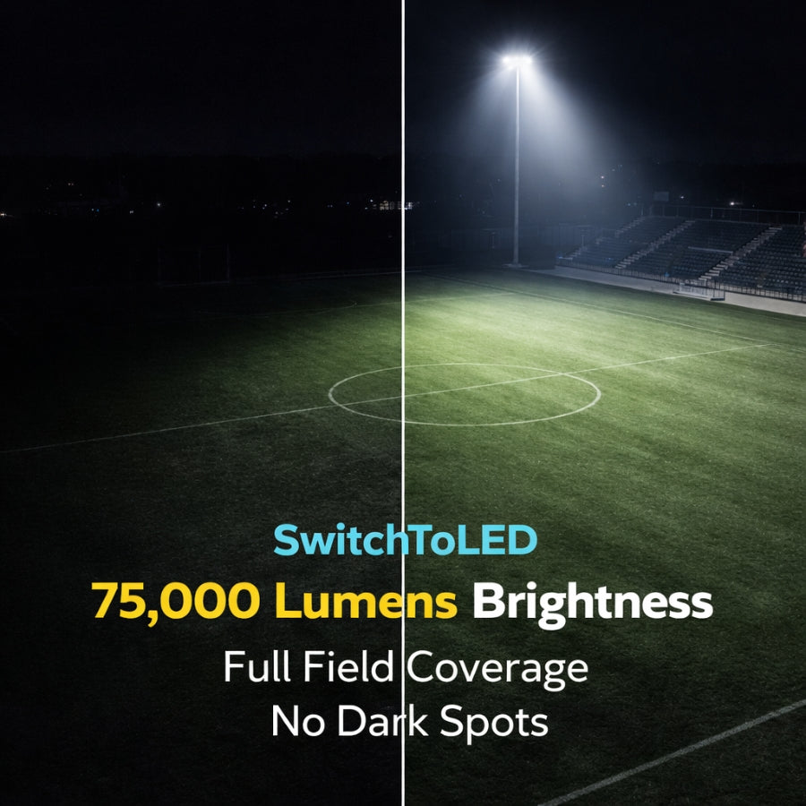 Upgrade your outdoor lighting with the SwitchToLED 300/400/500W LED Sport Light, a versatile stadium floodlight engineered for demanding sports and large‑area applications. With Opti‑Select technology, you can configure the fixture to 300W, 400W, or 500W output depending on your lighting needs, delivering up to 75,000 lumens of powerful 5000K daylight illumination. Designed as a 1500W Metal Halide Equivalent, this LED sport light replaces outdated metal halide systems with far greater energy efficiency and significantly lower maintenance costs.