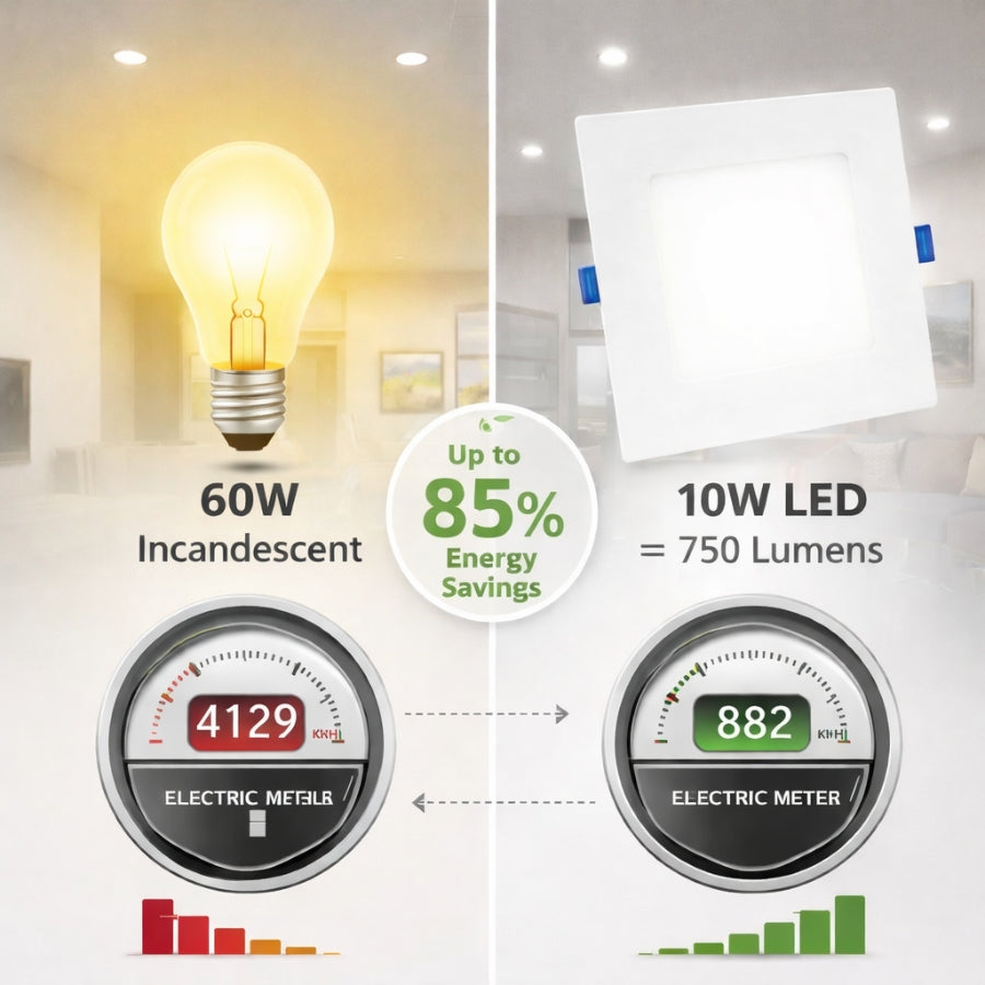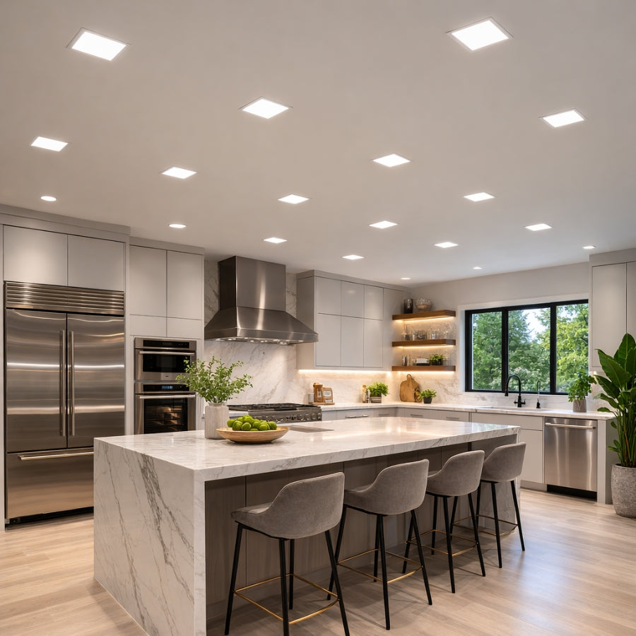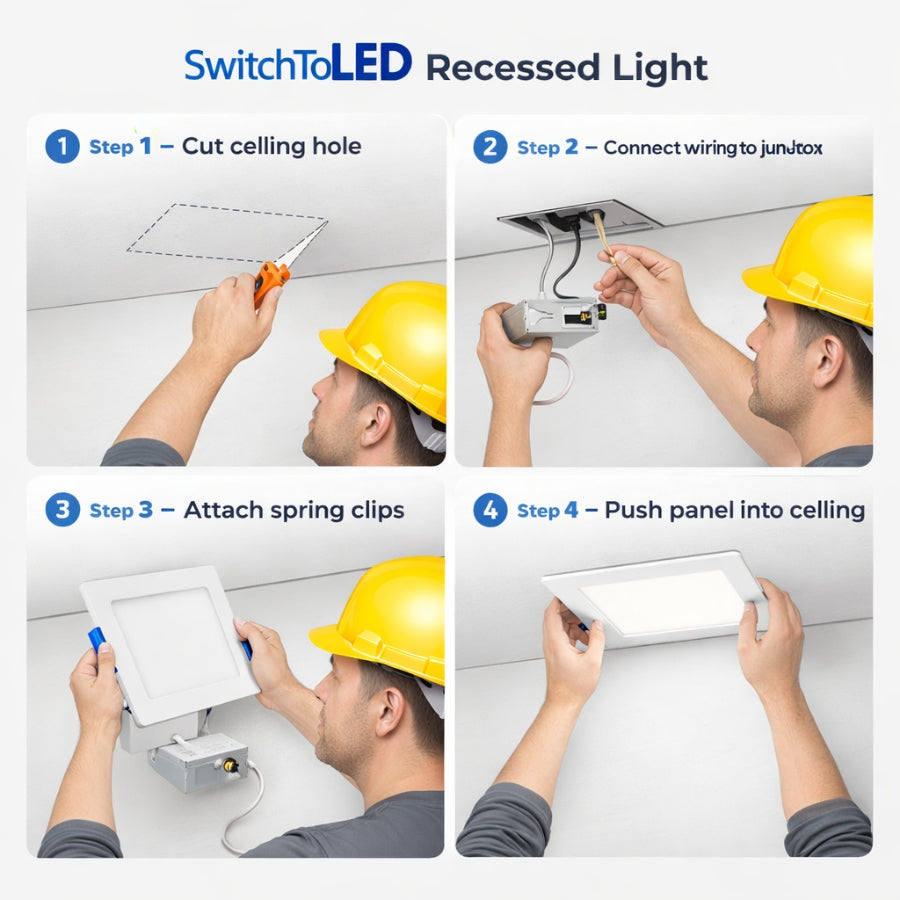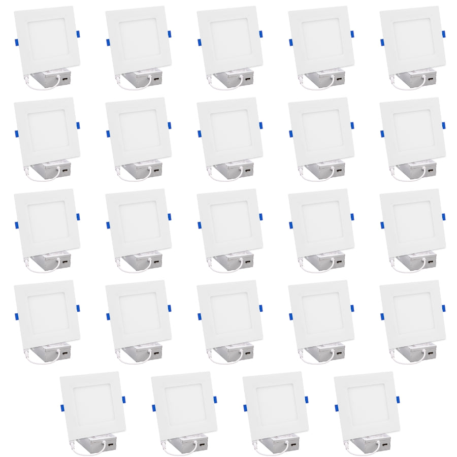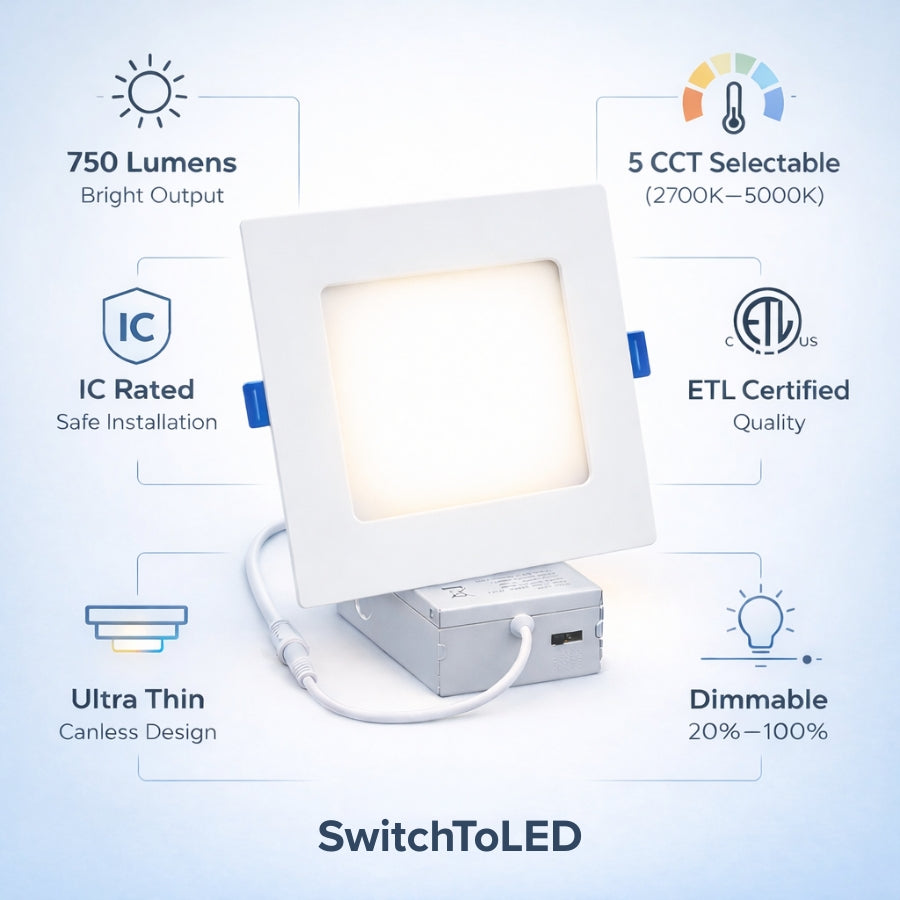 Upgrade modern interiors with the SwitchToLED 4-Inch Slim Square LED Recessed Downlight, an ultra-thin canless wafer ceiling light designed for simple installation and high-efficiency illumination. Producing 750 lumens while consuming only 10 watts, this recessed LED fixture delivers brightness comparable to a 60W incandescent light, helping reduce energy costs without sacrificing performance. The fixture features 5CCT selectable color temperatures (2700K / 3000K / 3500K / 4000K / 5000K), allowing contractors and homeowners to choose the ideal lighting tone during installation using the switch on the included junction box. Built with an IC-rated housing and ETL certification, the light is safe for ceilings with insulation contact and approved for damp locations such as kitchens and bathrooms. The ultra-thin canless design eliminates the need for recessed housings, making installation faster for both remodel and new construction projects. Backed by a 5-year SwitchToLED warranty and a 50,000-hour lifespan, this recessed LED downlight provides long-lasting, maintenance-free lighting for residential and commercial interiors.