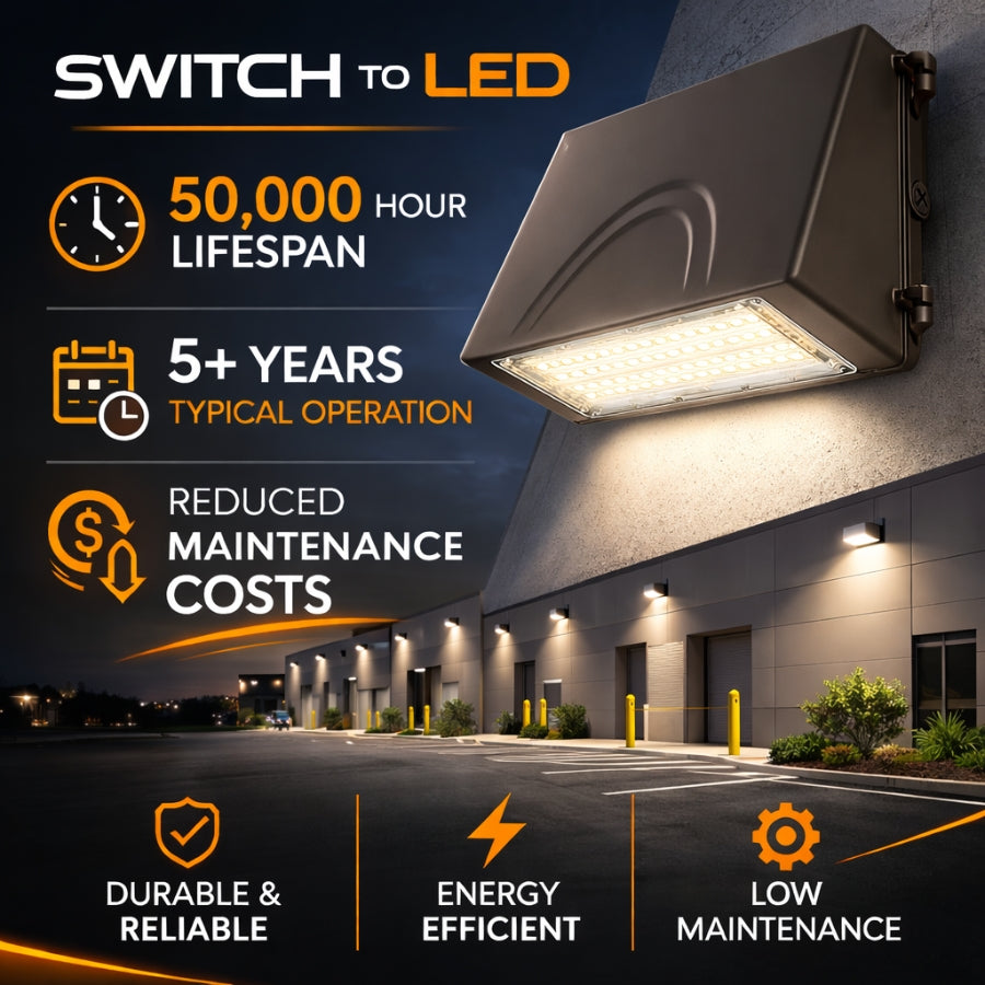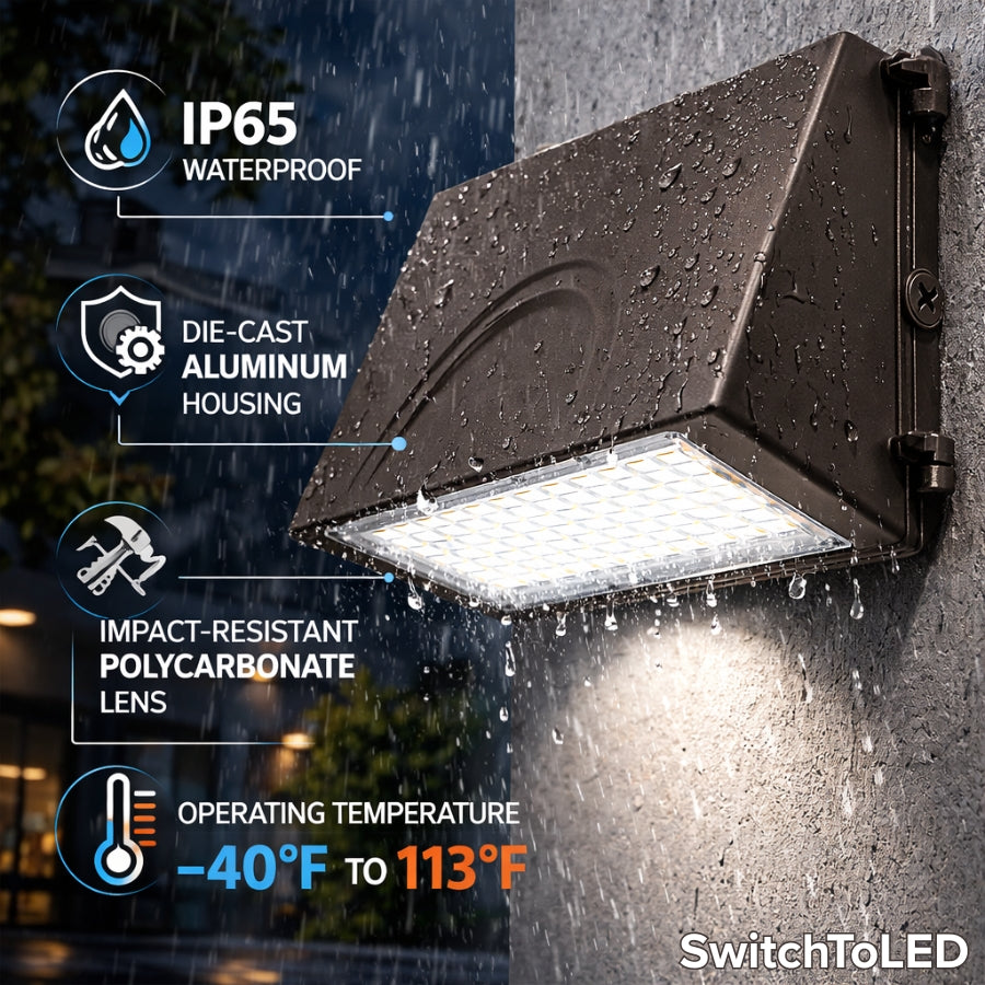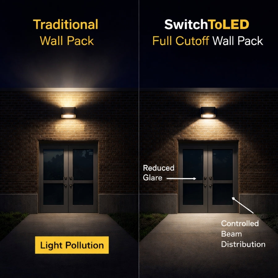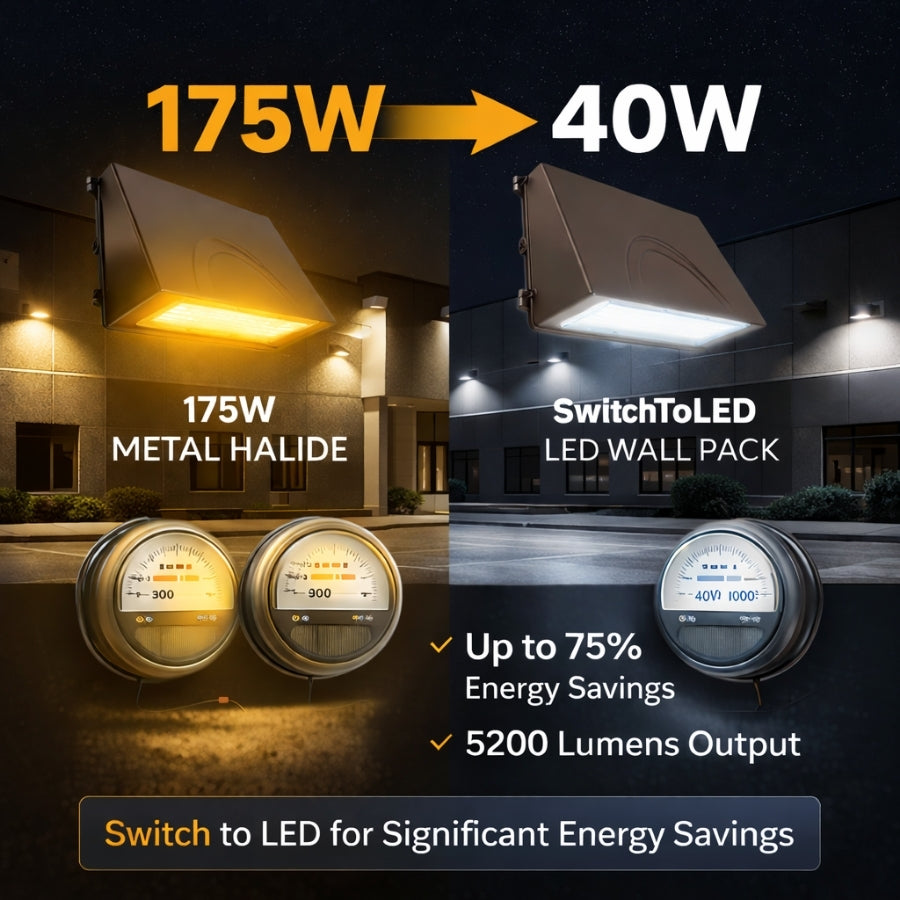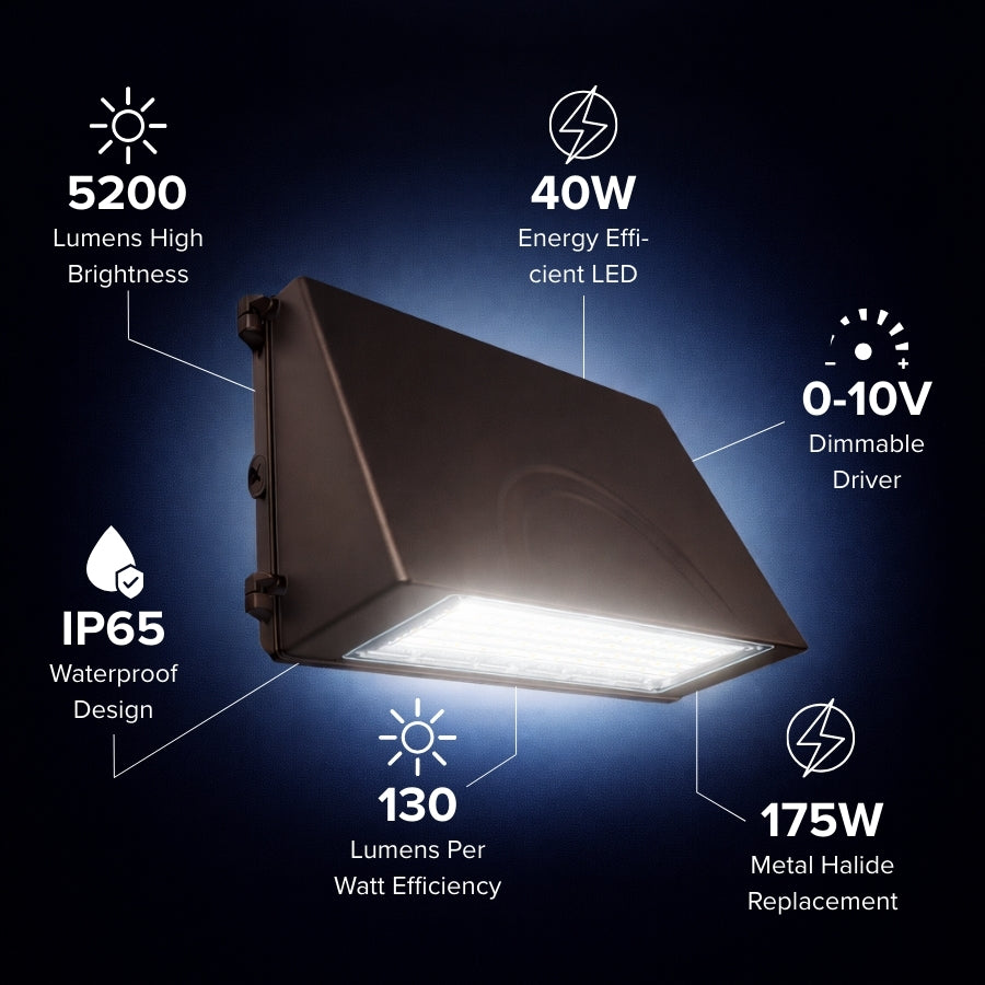 Upgrade outdated exterior lighting with the SwitchToLED 40W LED Full Cutoff Wall Pack, a commercial-grade outdoor lighting solution designed to replace traditional 175W metal halide wall pack fixtures. Delivering 5200 lumens of bright 5000K daylight illumination, this high-efficiency LED wall pack improves visibility and safety around building perimeters, walkways, entrances, warehouses, and commercial facilities. Built with a durable die-cast aluminum bronze housing and impact-resistant lens, this fixture provides long-lasting performance in demanding outdoor environments. The IP65 waterproof rating, 120-277V universal voltage, and 0-10V dimming capability make it ideal for contractors, facility managers, and commercial property upgrades. With energy-saving LED technology and a 175W metal halide equivalent output, this fixture significantly reduces energy costs while delivering reliable security lighting for commercial and industrial applications.