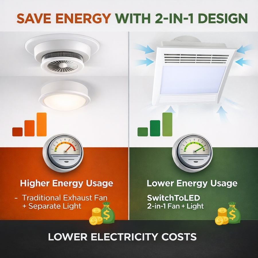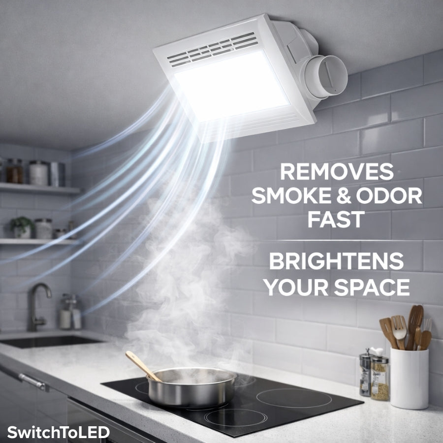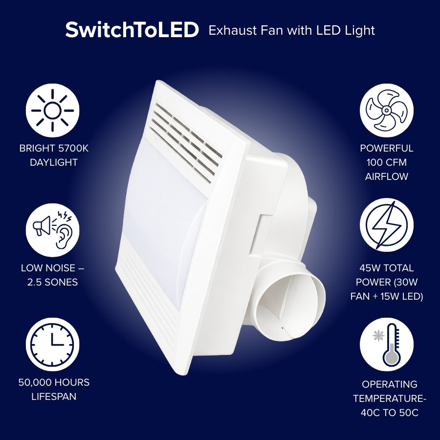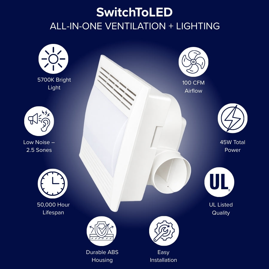 Upgrade your space with the SwitchToLED 45W LED Exhaust Fan with Light, a powerful 2-in-1 ceiling ventilation fan and lighting solution designed for modern homes and commercial environments. Featuring 100 CFM airflow, this quiet exhaust fan efficiently removes moisture, humidity, and odors, helping to prevent mold and mildew buildup while maintaining a fresh indoor environment. The integrated LED light delivers bright 5700K daylight illumination, ensuring clear visibility in bathrooms, laundry rooms, and utility spaces.