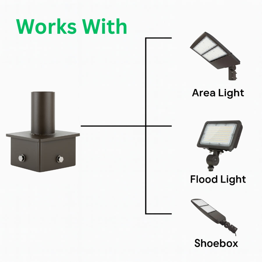 Built for long-term reliability, the dark bronze powder-coated finish resists corrosion, UV exposure, and harsh weather. The included four 5/16″ stainless-steel hex bolts ensure a tight, stable connection. Fixtures mounted to this bracket can be easily adjusted both vertically and horizontally, providing precise aiming for parking lots, streets, and commercial areas.
