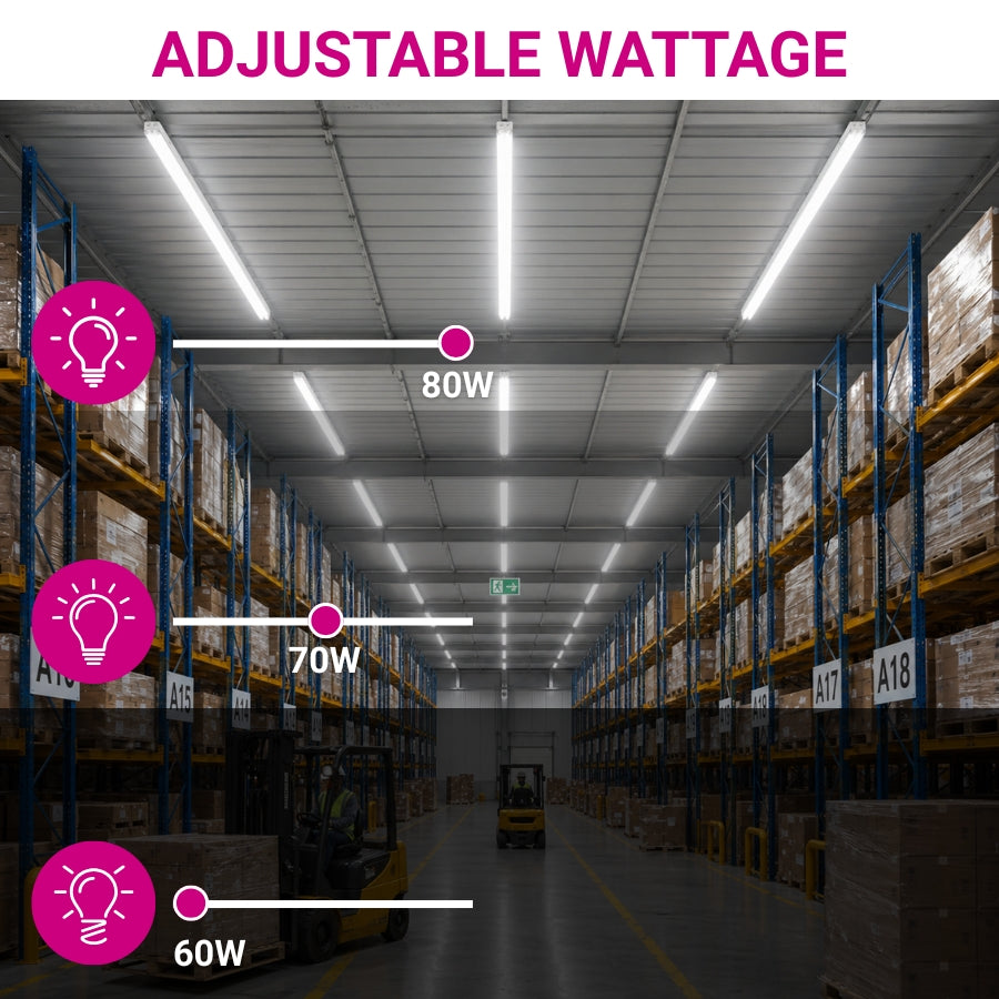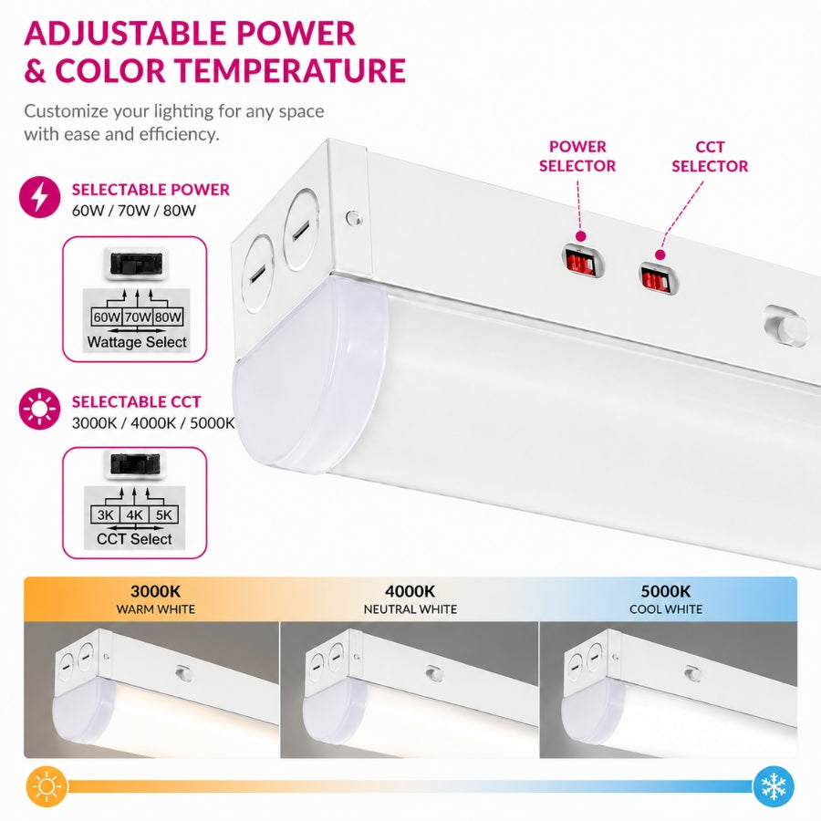 Take full control of your lighting with the SwitchToLED 8FT LED Strip Light Fixture, engineered for maximum performance, flexibility, and reliability. Delivering up to 11,674 lumens, this high-output fixture features selectable wattage (60W/70W/80W) and adjustable color temperature (3000K/4000K/5000K) via convenient DIP switches, allowing you to customize brightness and ambiance for any environment.