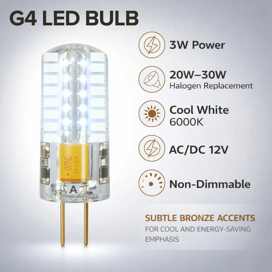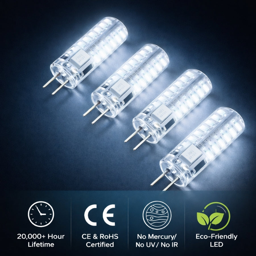 Upgrade your low-voltage lighting with SwitchToLED G4 LED Light Bulbs, engineered to replace traditional 20W halogen G4 bulbs while consuming just 3 watts of power. These bulbs emit a crisp cool white 6000K light, ideal for bright, clean illumination in cabinets, RVs, landscape fixtures, and display lighting.