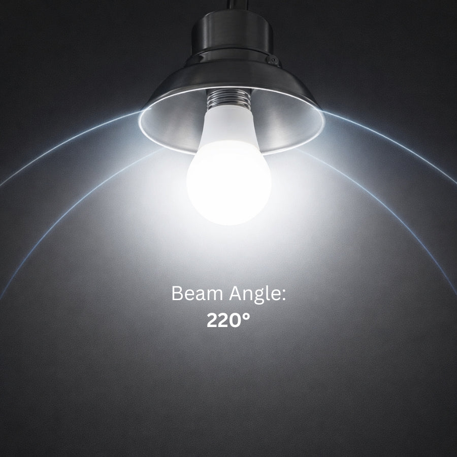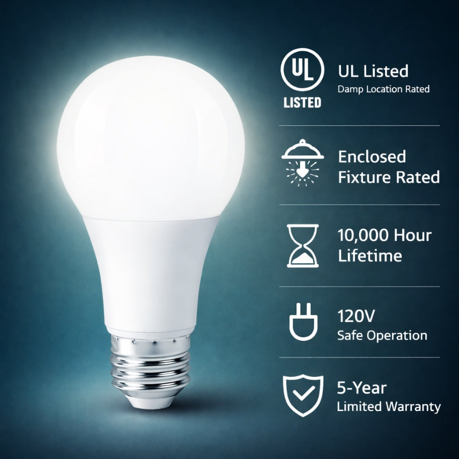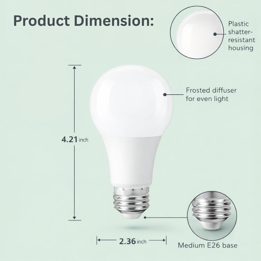 The frosted A19 design ensures even, glare-free illumination, while the durable plastic housing adds shatter and shake resistance, making it ideal for busy environments. With a 220° wide beam angle, light spreads evenly across workspaces, kitchens, bedrooms, and offices. Rated for enclosed fixtures and UL damp locations, this bulb offers safe, reliable performance indoors.