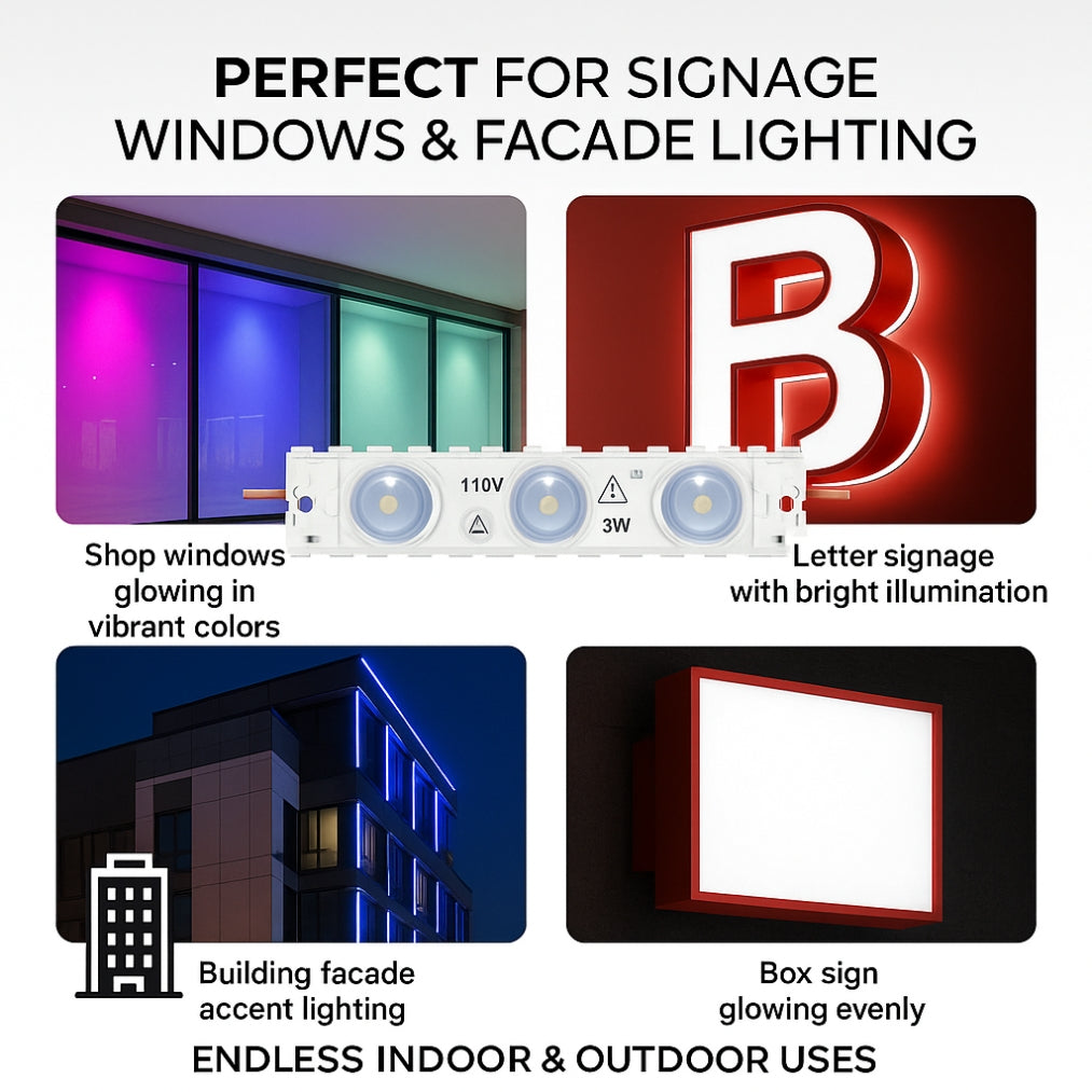 The LED Module Light from SwitchToLED is a versatile and efficient lighting solution, delivering 390 lumens per module with an impressive 130 lm/W efficacy. Designed for both residential and commercial applications, it’s available in a wide range of colors including Cool White, Warm White, Red, Green, Blue, Pink, Purple, Ice Blue, and Yellow.