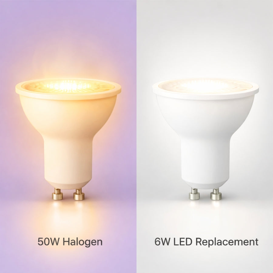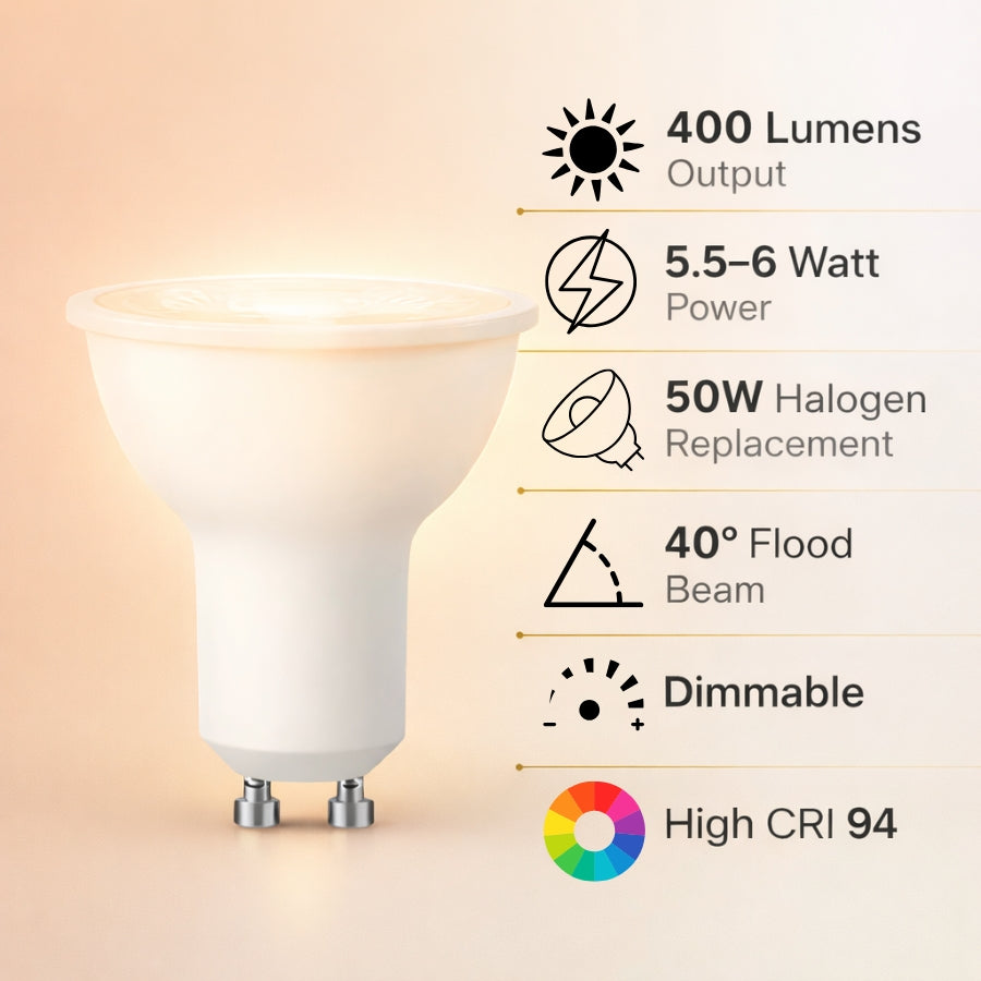Experience vivid, true-to-life illumination with the SwitchToLED LED PAR16 GU10 Bulb, engineered to deliver exceptional color accuracy and energy efficiency. Producing 400 lumens while consuming only 6 watts, this LED bulb replaces traditional 50W halogen PAR16 lamps, helping reduce energy costs without sacrificing performance.