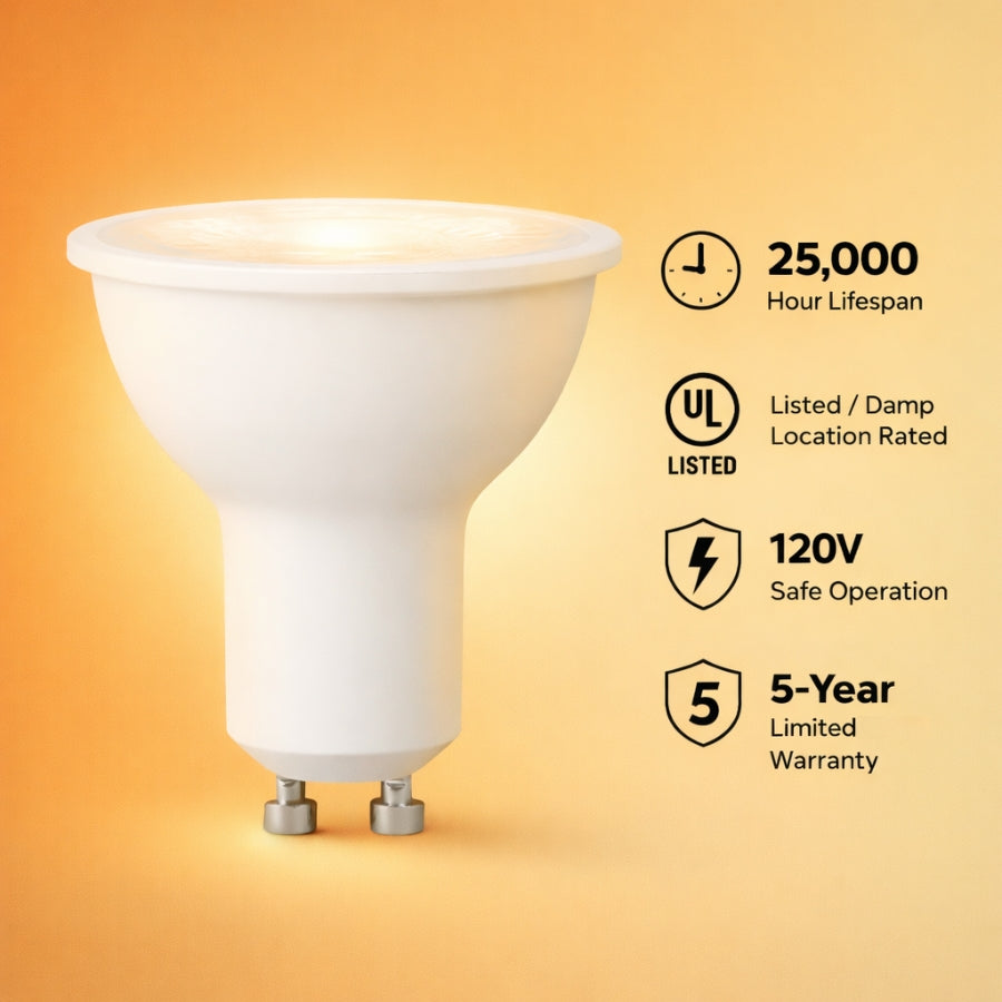 Designed with a 40-degree flood beam, this bulb offers balanced light distribution for track lighting and recessed fixtures. The GU10 twist-and-lock base ensures quick installation in standard 120V fixtures, and the bulb is fully dimmable when paired with compatible LED dimmers. With a 25,000-hour lifespan, UL damp-location rating, and 5-year limited warranty, this bulb delivers long-lasting, reliable performance.