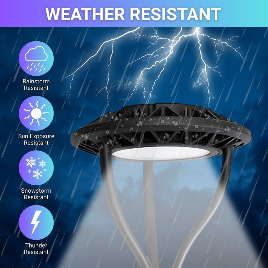 Its sleek black finish and frosted glass cover give a sophisticated appearance, while the standard T5 3" pole mount ensures universal compatibility. With IP65 waterproof protection and a built-in 0-10V dimmable driver, this light is ideal for all-weather, dusk-to-dawn operation (photocell sensor compatible but sold separately).